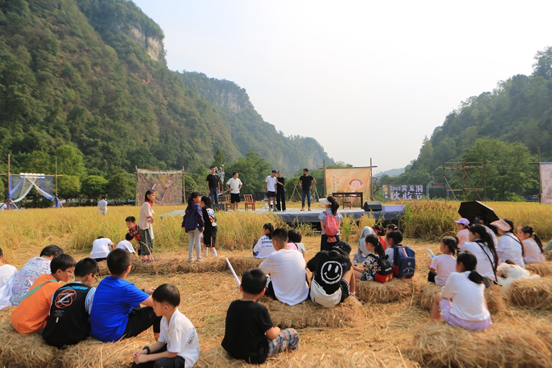 除了稻谷收割勞作體驗、勞動實踐這一常規(guī)保留項目外,第三屆黃龍洞秋收節(jié)還舉辦了包括稻作研學(xué)、稻田集市、田園音樂會、非遺文化體驗、戲劇藝術(shù)展演等豐富多彩的活動。在為期五天時間里,吸引了三萬多客人從四面八方趕赴過來。大家歡聚在黃龍洞外山谷的金色田野里,一起體驗勞動的快樂,感受豐收的喜悅,樂享戶外親子休閑生活。